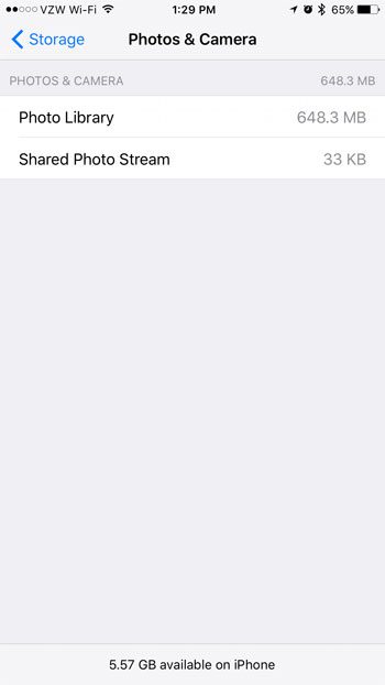 Για παράδειγμα, το iPhone μου στην παρακάτω εικόνα θα εμφανίσει τη χρήση αποθήκευσης από τη βιβλιοθήκη φωτογραφιών (τις εικόνες στο ρολό της κάμερας) καθώς και τις εικόνες στην κοινή ροή φωτογραφιών.