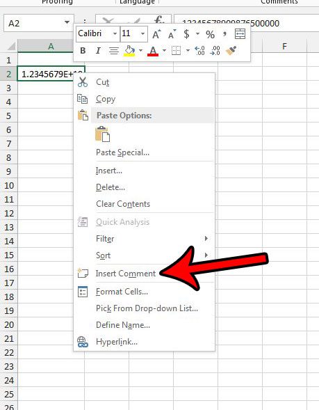 Μπορείτε επίσης να προσθέσετε ένα σχόλιο σε ένα κελί στο Excel 2013 κάνοντας δεξί κλικ στο επιλεγμένο κύτταρο, στη συνέχεια, επιλέγοντας τοΕισαγάγετε σχόλιοεπιλογή.