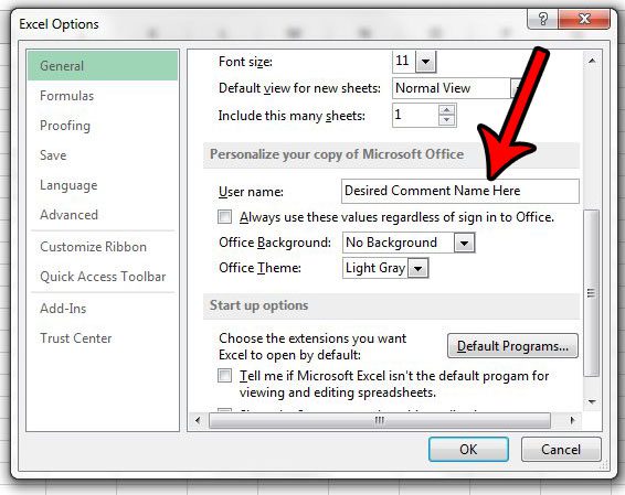 Εάν θέλετε να αλλάξετε το όνομα που εμφανίζεται σε νέα σχόλια που κάνετε, μπορείτε να το κάνετε κάνοντας κλικ στοΑρχείοκαρτέλα στην επάνω αριστερή γωνία του παραθύρου και, στη συνέχεια, κάνοντας κλικ στο κουμπίΕπιλογέςΣτην αριστερή στήλη. Στη συνέχεια, μπορείτε να κάνετε κλικ μέσα στοΟνομα χρήστηκάτω από το πεδίοΕξατομικεύστε το αντίγραφο του Microsoft OfficeΕνότητα για να εισαγάγετε το όνομα που θέλετε να χρησιμοποιήσετε.