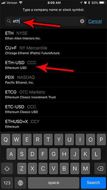 Βήμα 4: Πληκτρολογήστε το σύμβολο τριών γραμμάτων της κρυπτογράφησης που θέλετε να παρακολουθείτε στο πεδίο αναζήτησης στο επάνω μέρος της οθόνης και, στη συνέχεια, επιλέξτε το σωστό αποτέλεσμα αναζήτησης.