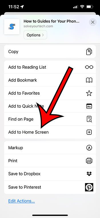 Βήμα 4: Μετακινηθείτε προς τα κάτω και επιλέξτε τοΠροσθήκη στην αρχική οθόνηεπιλογή.