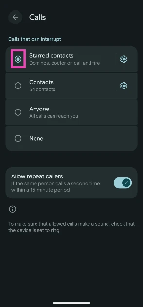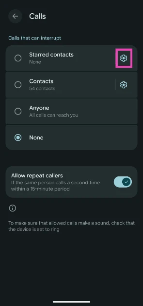 Εκτός από αυτά τα φίλτρα, υπάρχει μια επιλογή να αφήσετε τις κλήσεις από τις επαναλαμβανόμενες κλήσεις. Εάν ο ίδιος αριθμός σας καλεί σε περίοδο 15 λεπτών, η κλήση τους θα τρυπήσει το φίλτρο DND και θα εμφανιστεί στην οθόνη. Αυτό το χαρακτηριστικό διασφαλίζει ότι οι άνθρωποι είναι σε θέση να σας φτάσουν σε περιόδους έκτακτης ανάγκης, ακόμη και όταν το τηλέφωνό σας είναι ενεργοποιημένο δεν ενοχλεί.