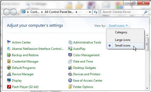 Βήμα 1: Για να εντοπίσετε τοΥπηρεσίεςμενού, κάντε κλικ στοΑρχήκουμπί στην κάτω αριστερή γωνία της οθόνης του υπολογιστή σας και, στη συνέχεια, κάντε κλικ στο κουμπίΠίνακας ελέγχου. Κάντε κλικ στο αναπτυσσόμενο μενού στην επάνω δεξιά γωνία του παραθύρου, δίπλα στοΠροβάλλω, στη συνέχεια κάντε κλικ στοΜικρά εικονίδιαεπιλογή.
