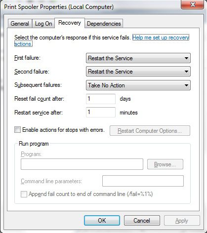 Στο επάνω μέρος του μενού εκτύπωσης είναι μια άλλη καρτέλα που πρέπει να ελέγξετε για να βεβαιωθείτε ότι το spooler εκτύπωσης συμπεριφέρεται σωστά. Κάντε κλικ στοΑνάκτησηκαρτέλα στο επάνω μέρος του παραθύρου. Αυτό το μενού περιέχει τις ρυθμίσεις για τον τρόπο με τον οποίο το spooler εκτύπωσης πρέπει να ανταποκριθεί σε περίπτωση που αποτύχει. Οι σωστές ρυθμίσεις για αυτό το μενού εμφανίζονται στην παρακάτω εικόνα.
