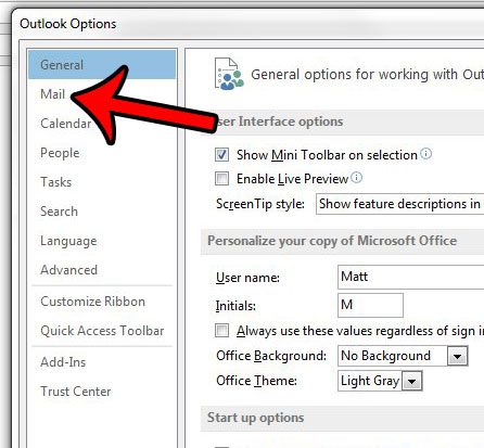 Βήμα 4: Κάντε κλικ στοΤαχυδρομείοκαρτέλα στην αριστερή πλευρά τουΕπιλογές προοπτικώνπαράθυρο.