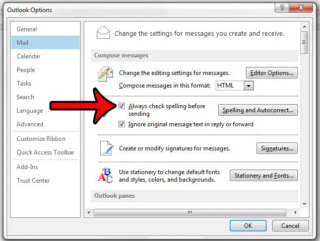 Βήμα 5: Ελέγξτε το πλαίσιο στα αριστερά τουΠάντα να ελέγχετε την ορθογραφία πριν από την αποστολή, στη συνέχεια κάντε κλικ στοΕΝΤΑΞΕΙκουμπί στην κάτω αριστερή γωνία του παραθύρου για να αποθηκεύσετε και να εφαρμόσετε τις αλλαγές σας.
