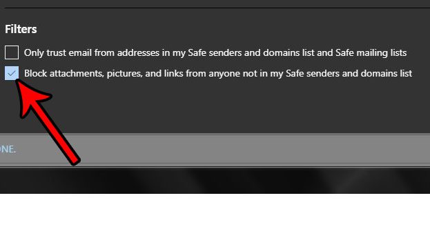 Βήμα 5: Μεταβείτε στο κάτω μέρος του μενού και ελέγξτε το πλαίσιο στα αριστερά τουΜπλοκ συνημμένα, εικόνες και συνδέσμους από οποιονδήποτε όχι στη λίστα ασφαλών αποστολέων και τομέων μου. Κάντε κλικ στοΕκτόςκουμπί στο επάνω δεξιά του μενού όταν τελειώσετε για να εφαρμόσετε τις αλλαγές.