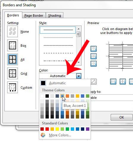 Βήμα 7: Κάντε κλικ στο αναπτυσσόμενο μενού κάτω από το χρώμα και, στη συνέχεια, κάντε κλικ στο χρώμα που θέλετε να χρησιμοποιήσετε για τον πίνακα.