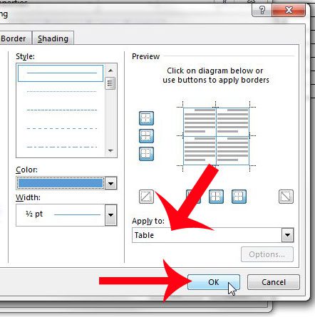 Βήμα 8: Κάντε τυχόν πρόσθετες αλλαγές στο στυλ του τραπεζιού ή στο πλάτος της γραμμής, επιβεβαιώστε ότι αυτόΤραπέζιεπιλέγεται κάτω από τοΕφαρμόζω σεεπιλογή στη δεξιά πλευρά του παραθύρου και, στη συνέχεια, κάντε κλικ στοΕΝΤΑΞΕΙκουμπί.