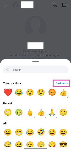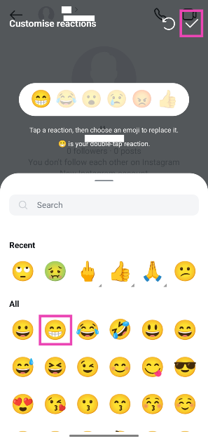 Πηγαίνετε στο DMS σας και ανοίξτε μια συνομιλία. Μεγάλο μέρος ενός μηνύματος για πρόσβαση στον πίνακα αντίδρασης. Χτυπήστε το εικονίδιο συν και πατήστε Προσαρμογή. Επιλέξτε την προεπιλεγμένη αντίδραση Emoji και πατήστε το εικονίδιο Tick.