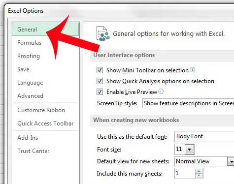 - Στο παράθυρο διαλόγου Επιλογές Excel, μεταβείτε στην καρτέλα "Γενικά".