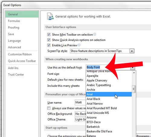 Μπορείτε να αλλάξετε την προεπιλεγμένη γραμματοσειρά Excel 2013 πηγαίνοντας στοΑρχείο> Επιλογές> Γενικά> Χρησιμοποιήστε αυτό ως προεπιλεγμένη γραμματοσειρά>Επιλέγοντας μια γραμματοσειρά>κάνοντας κλικΕΝΤΑΞΕΙ.