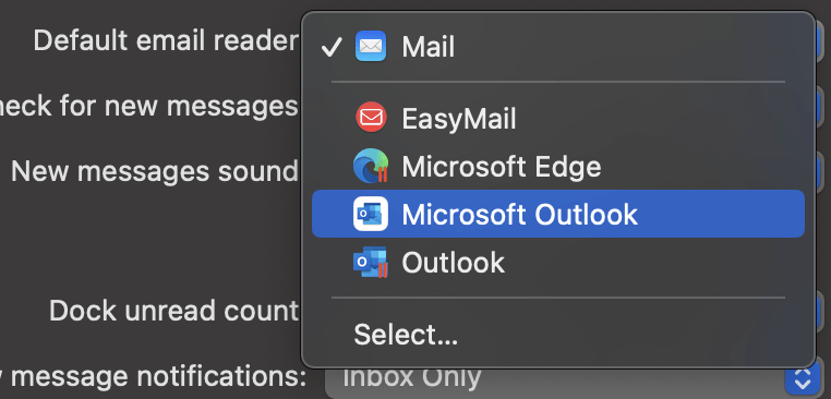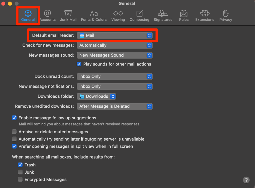 - Χρησιμοποιήστε την εφαρμογή Apple Mail στοπρόσβαση στις ρυθμίσεις αλληλογραφίαςκαιΑλλαγή της προεπιλεγμένης εφαρμογής αλληλογραφίαςστο Mac σας.