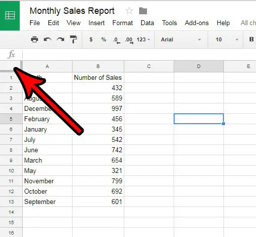 Βήμα 2: Κάντε κλικ στο κουμπί πάνω από τη σειρά 1 και στα αριστερά της στήλης Α για να επιλέξετε ολόκληρο το υπολογιστικό φύλλο.