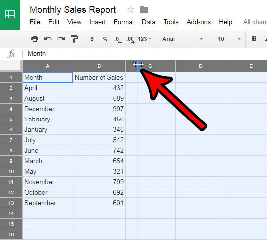 Τα βήματα σε αυτό το άρθρο πρόκειται να σας δείξουν έναν γρήγορο τρόπο για να αλλάξετε το πλάτος των πολλαπλών στηλών σε ένα υπολογιστικό φύλλο Google Sheets.