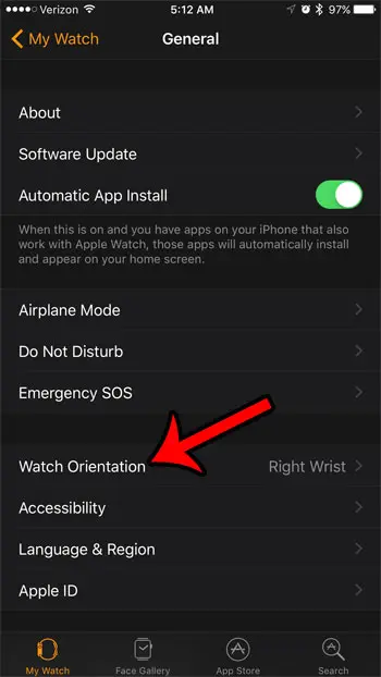 Βήμα 5: Επιλέξτε τον καρπό στον οποίο θέλετε να φορέσετε το ρολόι της Apple. Επιπλέον, βεβαιωθείτε ότι η ρύθμιση για το Digital Crown ευθυγραμμίζεται με το πώς θα φοράτε το ρολόι στον καρπό σας. Εάν αλλάξετε τη ρύθμιση του καρπού, αλλά μην αλλάξετε τη ρύθμιση του ψηφιακού στεφάνου, τότε ο προσανατολισμός του προσώπου του ρολογιού δεν θα αλλάξει.