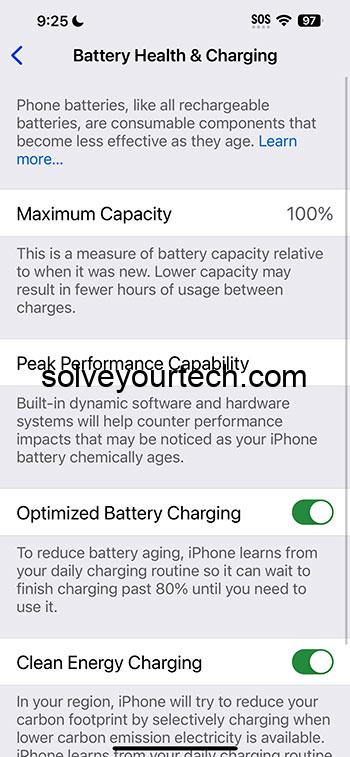 Αφού ολοκληρώσετε αυτήν την ενέργεια, θα μπορείτε να δείτε τη μέγιστη χωρητικότητα της μπαταρίας σας σε σύγκριση με το όταν ήταν καινούργιο. Θα γνωρίζετε επίσης εάν η μπαταρία του iPhone σας υποστηρίζει επί του παρόντος κανονική απόδοση αιχμής ή εάν έχει ενεργοποιήσει τα χαρακτηριστικά διαχείρισης απόδοσης για να αποτρέψει την απροσδόκητη διακοπή λειτουργίας.