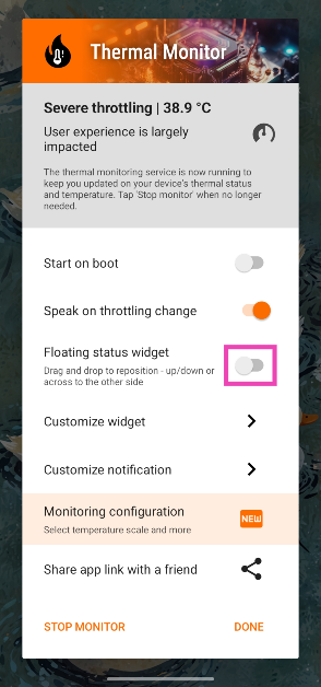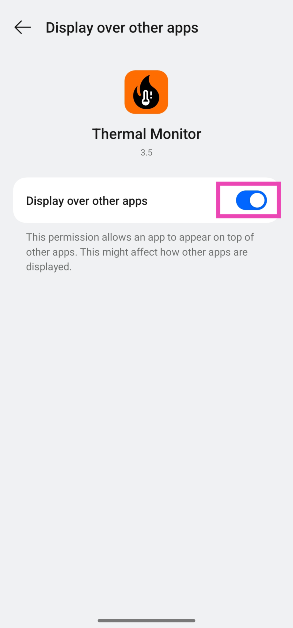 Εγκαταστήστε την εφαρμογή θερμικής οθόνης, ενεργοποιήστε το διακόπτη εναλλαγής δίπλα στο "Floating Status Widget" και αφήστε την εφαρμογή να εμφανίζει πάνω από άλλες εφαρμογές. Μόλις γίνει αυτό, η εφαρμογή θα επικαλύψει την εσωτερική θερμοκρασία του τηλεφώνου σας στην οθόνη.