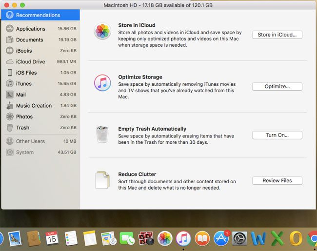 Θα σημειώσετε ότι υπάρχει έναΔιαχειρίζομαιΕπιλογή δίπλα στον σκληρό σας δίσκο σε αυτήν την οθόνη. Εάν κάνετε κλικ, θα δείτε μια άλλη οθόνη με κάποιες επιλογές για τρόπους εκκαθάρισης χώρου στο δίσκο εκκίνησης.