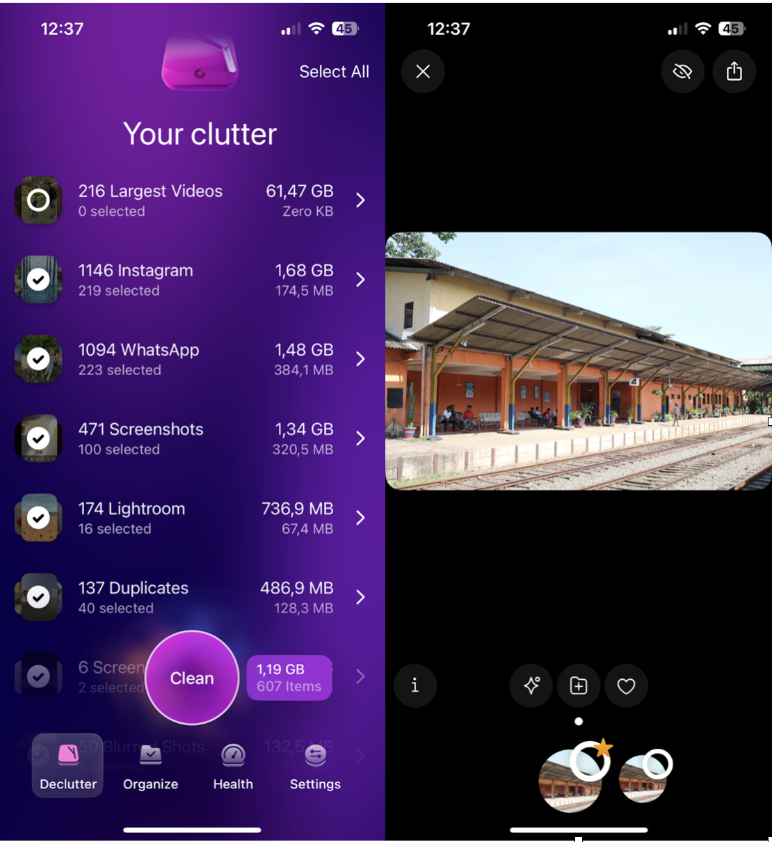 Χρησιμοποιήστε τη μονάδα Declutter απόCleanMy® Phoneγια να αφαιρέσετε τόνους ανεπιθύμητων μέσων. Σαρώνει τις Φωτογραφίες σας και ομαδοποιεί την ακαταστασία σε σαφείς κουβάδες, όπως Διπλότυπα, Παρόμοια, Στιγμιότυπα οθόνης, Εγγραφές οθόνης, Θολά, Μεγάλα βίντεο και Φάκελοι εφαρμογών. Αυτοί οι φάκελοι εφαρμογών εμφανίζουν μέσα που οι εφαρμογές έχουν αποθηκεύσει στη βιβλιοθήκη σας, όπως το WhatsApp και το Instagram, ώστε να μπορείτε να τα ελέγξετε και να τα αφαιρέσετε από ένα μέρος. Δείτε πώς: