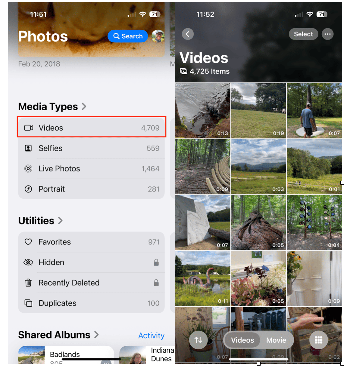 Τα βίντεο αναλαμβάνουν το μεγαλύτερο χώρο στο iPhone σας. Δείτε πώς μπορείτε να εντοπίσετε και να διαγράψετε αρχεία βίντεο. Μεταβείτε στην εφαρμογή Φωτογραφιών σας> Άλμπουμ> Βίντεο και, στη συνέχεια, διαγράψτε οτιδήποτε δεν χρειάζεστε.