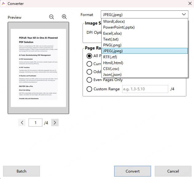Για όσους χρειάζονται πιο προηγμένες λειτουργίες ή θέλουν έναν φιλικό προς το χρήστη τρόπο μετατροπής του PDF σε JPG MAC, λογισμικό PDF τρίτου μέρους όπωςΦτερωτόςπροσφέρει μια επαγγελματική λύση. Το PDFULL παρέχει έναν διαισθητικό επεξεργαστή και μετατροπέα PDF που τροφοδοτείται με AI που μπορεί εύκολα να χειριστεί μετατροπή PDF σε JPG με υψηλή ποιότητα και ακρίβεια.