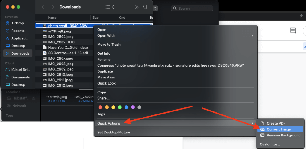 Ο πιο γρήγορος τρόπος για να μετατρέψετε μια ακατέργαστη εικόνα είναι να την εντοπίσετεΕυρίσκων, κάντε δεξί κλικ, επιλέξτεΓρήγορες ενέργειες, και κάντε κλικ στοΜετατρέψτε την εικόνα.