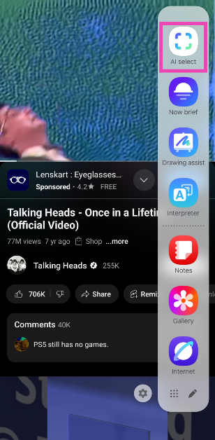 Παίξτε ένα βίντεο στο τηλέφωνό σας Samsung, σύρετε τον πίνακα Edge και πατήστε στο 'AI SELECT'. Πατήστε τις ελλείψεις, επιλέξτε 'Δημιουργία gif', καταγράψτε το βίντεο και πατήστε Σταματήστε όταν τελειώσετε. Πατήστε το εικονίδιο βέλους για να αποθηκεύσετε το GIF στο τηλέφωνό σας.