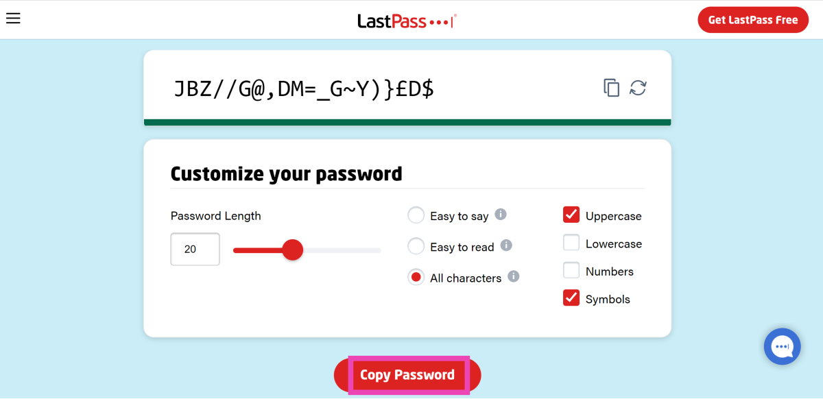 Βήμα 3:Το LastPass θαπαράγωΈνας τυχαίος κωδικός πρόσβασης για εσάς. ΜπορείτεπροσαρμόζωΠεραιτέρω αυξάνοντας το μήκος του, καθιστώντας ευκολότερο να πούμε ή να διαβάζουμε, να προσθέτουμε ή να αφαιρεί τα κεφαλαία/πεζά γράμματα, τους ειδικούς χαρακτήρες και τους αριθμούς.