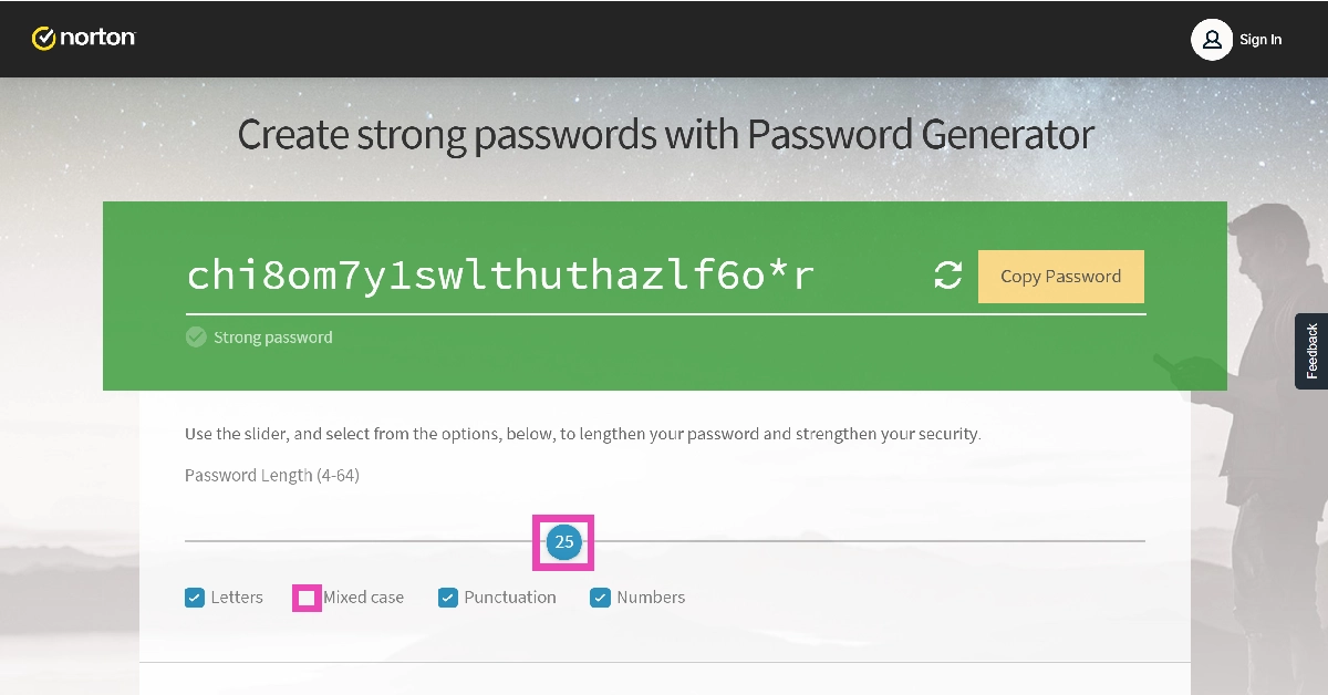 Μεταβείτε στην γεννήτρια του LastPass, Avast ή Norton και θα εμφανιστεί ένας ισχυρός κωδικός πρόσβασης στην οθόνη. Μπορείτε να χρησιμοποιήσετε το ρυθμιστικό για να αλλάξετε το μήκος του κωδικού πρόσβασης και να αποφασίσετε τα χαρακτηριστικά του.