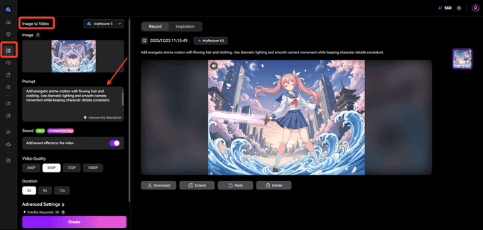 Επιλέξτε τη μέθοδο σας, προσαρμόστε τις προτροπές σας και αφήστε το Anycreate να μετατρέψει τις ιδέες σας για χαρακτήρες anime σε κίνηση.