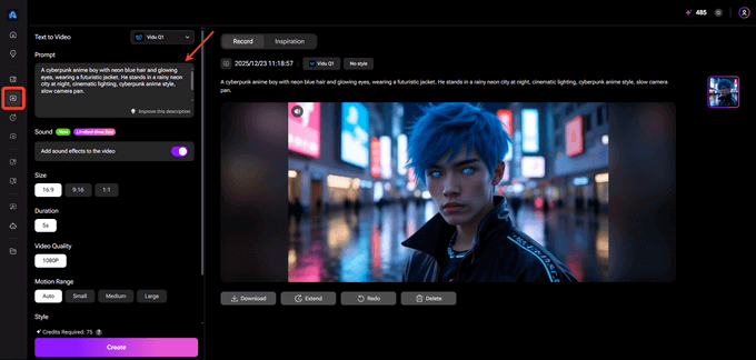 Περιγράφετε την εμφάνιση, το στυλ, το περιβάλλον και την κίνηση του χαρακτήρα. Το Anycreate μετατρέπει την περιγραφή σας σε ένα πλήρως κινούμενο βίντεο anime.