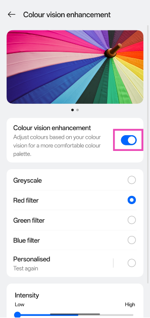 Στο Android 15, μπορείτε να αλλάξετε την ένταση αυτών των φίλτρων. Εάν δεν θέλετε να χρησιμοποιείτε αυτά τα φίλτρα όλη την ώρα, μπορείτε να προσθέσετε μια συντόμευση στην οθόνη για να τα ενεργοποιήσετε ή να απενεργοποιήσετε.