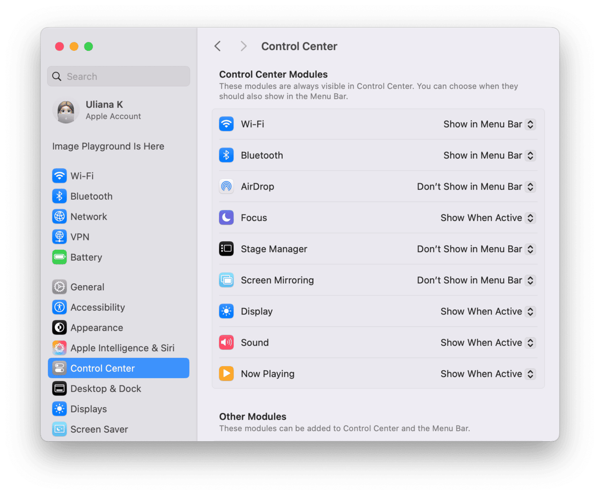 - Επιλέξτε το κέντρο ελέγχου. Θα δείτε μια λίστα με τις μονάδες του κέντρου ελέγχου. Κάντε κλικ στο μενού δίπλα σε ένα που θέλετε να προσθέσετε ή να αφαιρέσετε από τη γραμμή μενού και να επιλέξετε 'Εμφάνιση στη γραμμή μενού' '' Μην εμφανίζετε στη γραμμή μενού, 'ή' Εμφάνιση όταν είναι ενεργή.