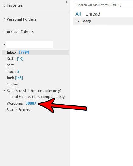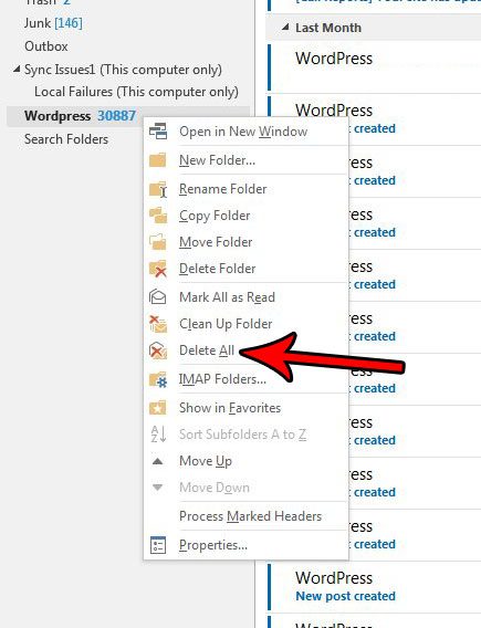 Βήμα 2: Εντοπίστε το φάκελο που περιέχει τα μηνύματα ηλεκτρονικού ταχυδρομείου που θέλετε να διαγράψετε. Διαγράφω όλα τα μηνύματα ηλεκτρονικού ταχυδρομείου στο φάκελο WordPress στην παρακάτω εικόνα.