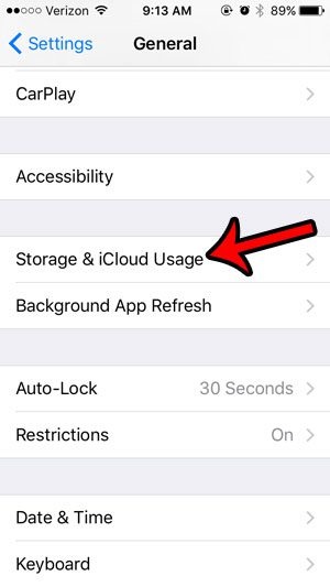 Ανοίξτε το γενικό μενού iOS 9Βήμα 3: Μετακινηθείτε προς τα κάτω και πατήστεΑποθήκευση και χρήση iCloud.