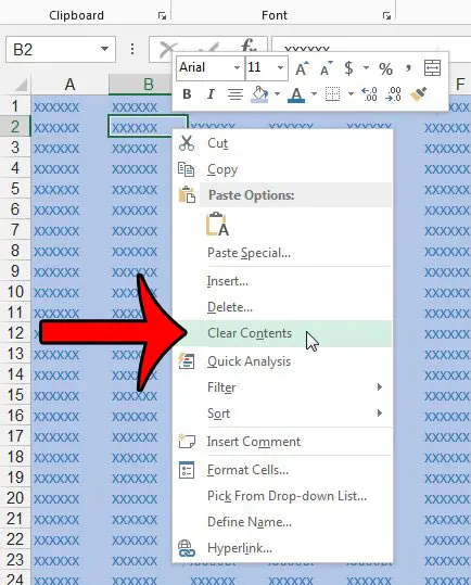 Βήμα 2: Κάντε δεξί κλικ σε ένα από τα επιλεγμένα κύτταρα και, στη συνέχεια, κάντε κλικ στοΚαθαρά περιεχόμεναεπιλογή.