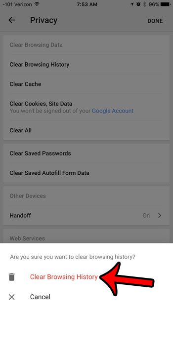 - Πατήστε τοΚαθαρίστε το ιστορικό περιήγησηςΣτο κάτω μέρος της οθόνης για να ολοκληρωθεί η διαγραφή.