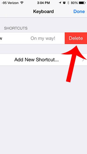 Βήμα 6: Αγγίξτε τοΔιαγράφωκουμπί στα δεξιά της συντόμευσης. Εάν υπάρχουν άλλες συντομεύσεις στην οθόνη, τότε μπορείτε να αγγίξετε τοΓινώμενοςκουμπί για έξοδο από αυτήν την οθόνη. Διαφορετικά, θα επιστρέψετε αυτόματα στο μενού πληκτρολογίου.