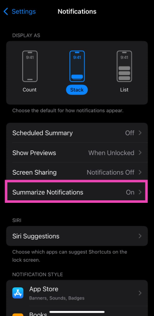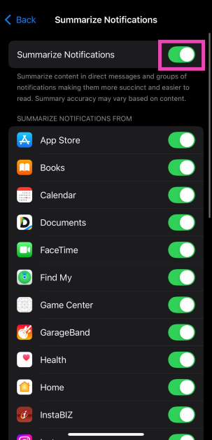 Αυτή η λειτουργία είναι ενεργοποιημένη από προεπιλογή στο iPhone σας. Όπως υποδηλώνει το όνομα, δημιουργεί σύντομες και ακριβείς περιλήψεις για τις εισερχόμενες ειδοποιήσεις στο iPhone σας. Εάν αισθάνεστε ότι αυτή η λειτουργία γεμίζει τον πίνακα ειδοποιήσεων, μπορείτε να το απενεργοποιήσετε εξ ολοκλήρου ή για ορισμένες εφαρμογές.