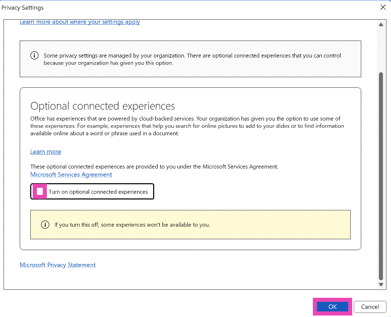 ΠηγαίνωΑρχείο> Επιλογές> Κέντρο εμπιστοσύνης> Ρυθμίσεις του κέντρου εμπιστοσύνης> Επιλογές απορρήτου> Ρυθμίσεις απορρήτου, και καταργήστε την επιλογή του κουτιού δίπλα στο «Ενεργοποιήστε τις εμπειρίες που αναλύουν το περιεχόμενό σας».
