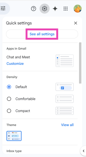 Βήμα 1:Μεταβείτε στα εισερχόμενά σας Gmail και πατήστε τοεικονίδιο τροχούΣτην επάνω δεξιά ενότητα της οθόνης.