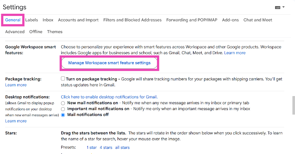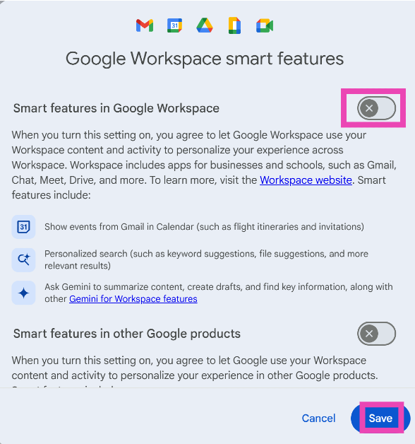 Χτυπήστε το εικονίδιο του τροχού COG, επιλέξτε 'Δείτε όλες τις ρυθμίσεις', μετακινηθείτε προς τα κάτω και κάντε κλικ στο 'Διαχείριση των ρυθμίσεων χαρακτηριστικών WorkSpace Smart χαρακτηριστικών' και απενεργοποιήστε το διακόπτη εναλλαγής δίπλα σε 'Smart Features in Google Workspace'.