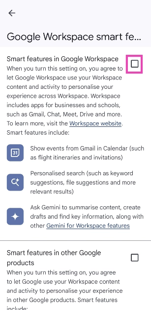 Βήμα 5:Μετακινηθείτε προς τα κάτω και επιλέξτεGoogle Workspace Smart Χαρακτηριστικά.