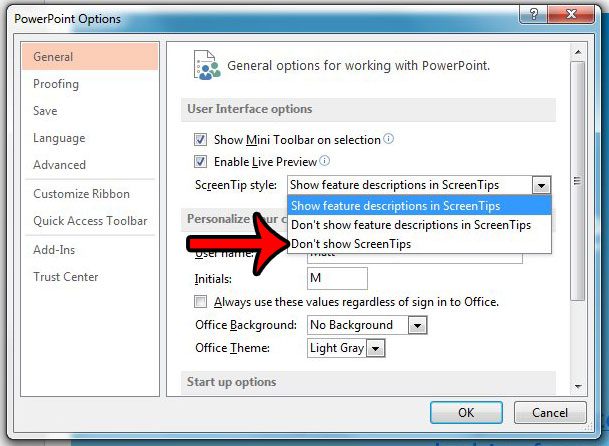 Τα βήματα στον παρακάτω οδηγό θα απενεργοποιήσουν τη λειτουργία Screentips στο PowerPoint 2013. Εμφανίζονται ο Screentips όταν παρατηρείτε σε μια επιλογή μενού στο πρόγραμμα και μια περιγραφή του τι κάνει αυτό το στοιχείο μενού.