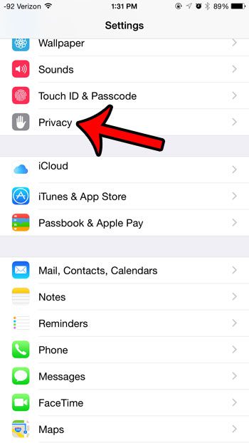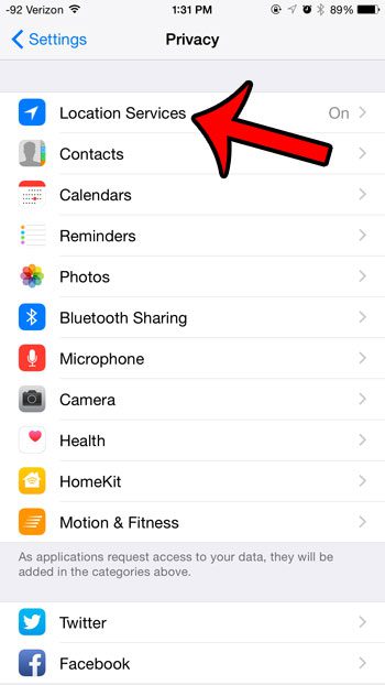 Βήμα 3: Πατήστε τοΥπηρεσίες τοποθεσίαςκουμπί. Εάν επιλέξατε να περάσετε από το μενού iCloud, τότε θα χρειαστεί να μετακινηθείτε στο κάτω μέρος του μενού και να επιλέξετε τοΜοιραστείτε την τοποθεσία μουΕπιλογή αντ 'αυτού (μπορείτε επίσης να παραλείψετε το βήμα 4).