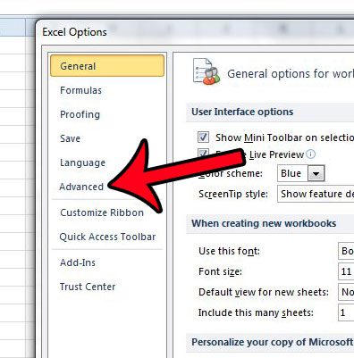 - Κάντε κλικ στοΠροχωρημένοςκαρτέλα στην αριστερή πλευρά τουΕπιλογές του Excelπαράθυρο.