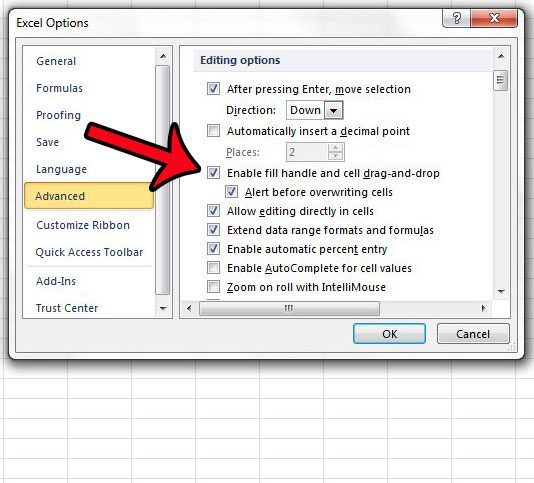 - Μετακινηθείτε προς τα κάτω στοΕπιλογές επεξεργασίαςΤμήμα του παραθύρου και, στη συνέχεια, ελέγξτε το πλαίσιο στα αριστεράΕνεργοποιήστε τη λαβή πλήρωσης και τη μεταφορά και την πτώση των κυττάρωνΕάν θέλετε να χρησιμοποιήσετε το εργαλείο λαβής πλήρωσης. Εάν όχι, καταργήστε την επιλογή του κουτιού. Στην παρακάτω εικόνα, η λαβή πλήρωσης είναι ενεργοποιημένη. Μόλις ολοκληρώσετε τις αλλαγές σας, κάντε κλικ στοΕΝΤΑΞΕΙκουμπί για να κλείσετε το παράθυρο.