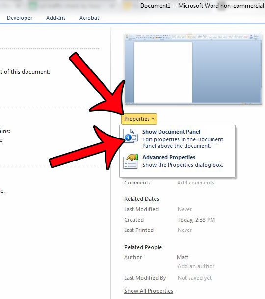 Βήμα 4: Στη συνέχεια, μπορείτε να κάνετε αλλαγές σε οποιαδήποτε από αυτές τις τιμές επεξεργάζοντας τα δεδομένα στο κατάλληλο πεδίο. Μπορείτε επίσης να κάνετε πρόσθετες αλλαγές κάνοντας κλικ στοΙδιότητες εγγράφωνσύνδεσμος στο επάνω μέρος του πίνακα εγγράφων και, στη συνέχεια, κάνοντας κλικ στοΠροηγμένες ιδιότητεςεπιλογή.