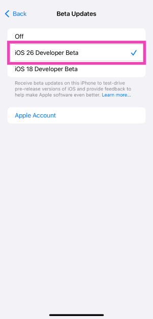 Βήμα 9:ΕπιλέγωiOS 26 προγραμματιστής betaαπό τη λίστα.